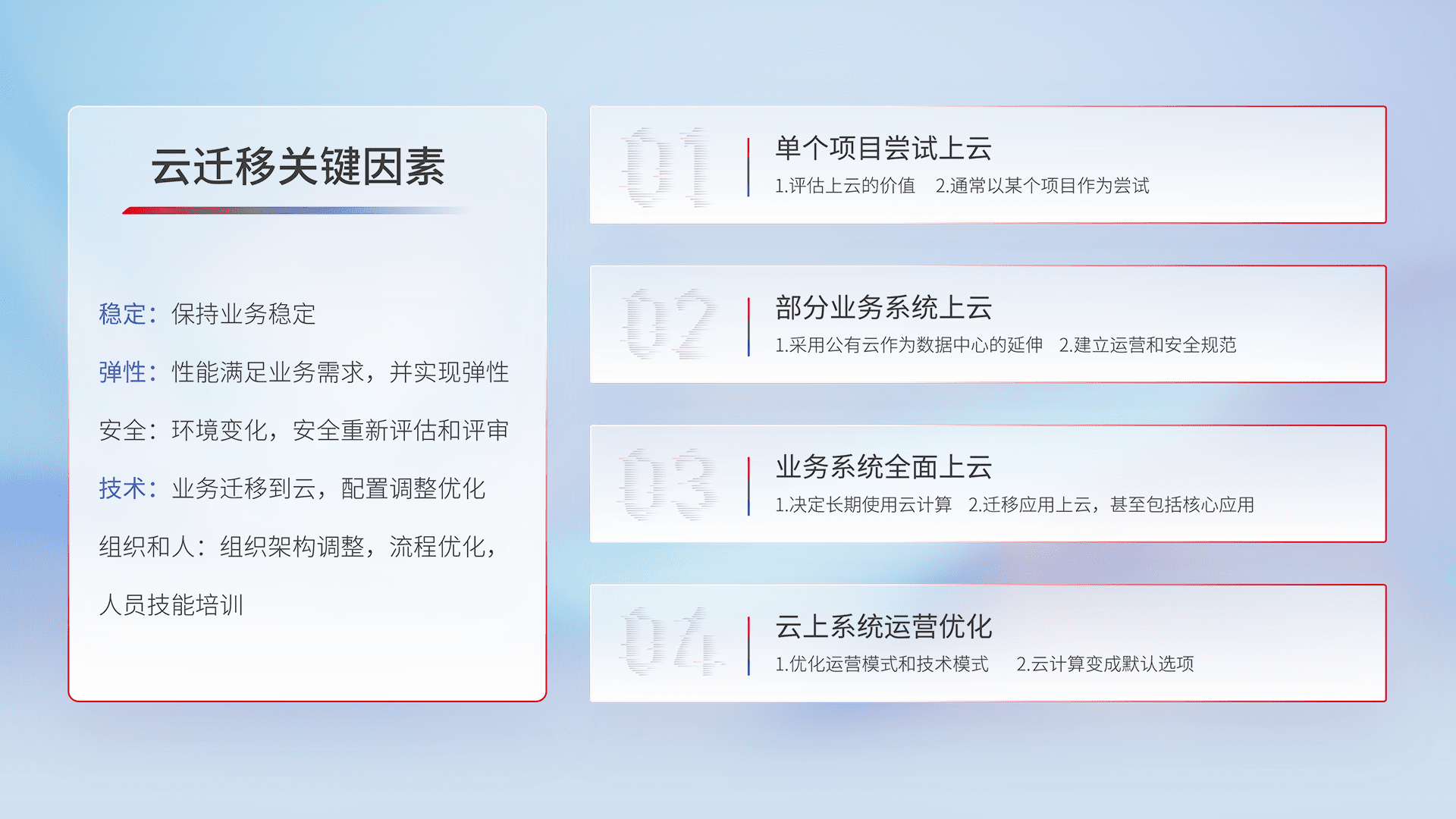 结合实际业务,,,,从规划设计、、、、云平台选型、、云原生改造、、、、数据迁移、、集成交付,,,,迁移全过程为客户识别最佳上云路径,,,,做好风险识别管理,,,设计网络架构、、、、身份权限、、安全审计合规、、、、操作审计、、、、日志审计、、、监控告警策略、、、、多站点容灾设计等,,,,对云上基础设施进行整体规划,,,提升IT治理水平,,以满足弹性、、、、高可用、、、高性能的需求。。