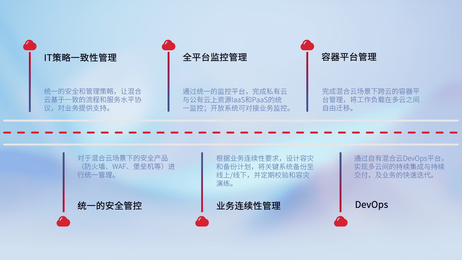 通过多云纳管,,,以统一的资源数据模型把客户的云资源进行抽象和封装,,进而实现对多云资源的统一操作,,保障云资源管理的可靠性、、、、稳定性与可用性。。。。量身定制化运维内容,,配置、、开发运维、、补丁管理、、、备份、、、监控、、、、认证和访问管理、、、审计和日常巡检等,,保障在用云过程中的可靠度,,,稳定度以及高可用率。。。。
